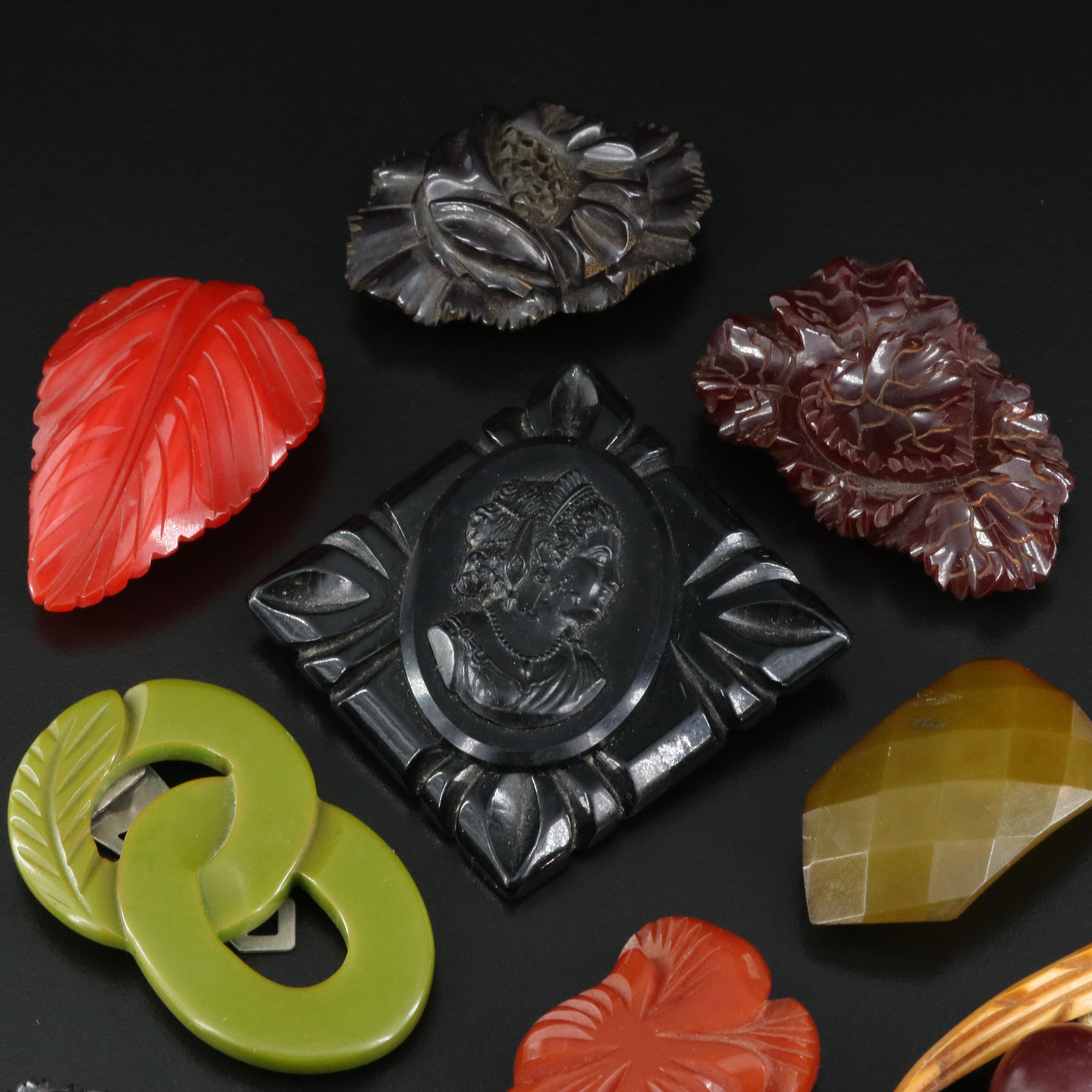 Vintage Carved Bakelite Brooches, Clips and Pendant EBTH